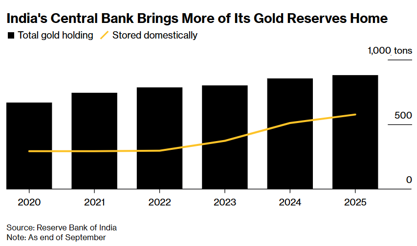 截至2025年9月底,该行已将超过65%的黄金储备存放在国内,这一比例较四年前近乎翻倍,且在2025年4月开启的财政年度前六个月内,累计从海外运回近64吨黄金,凸显出加速黄金回流的明确态势。
